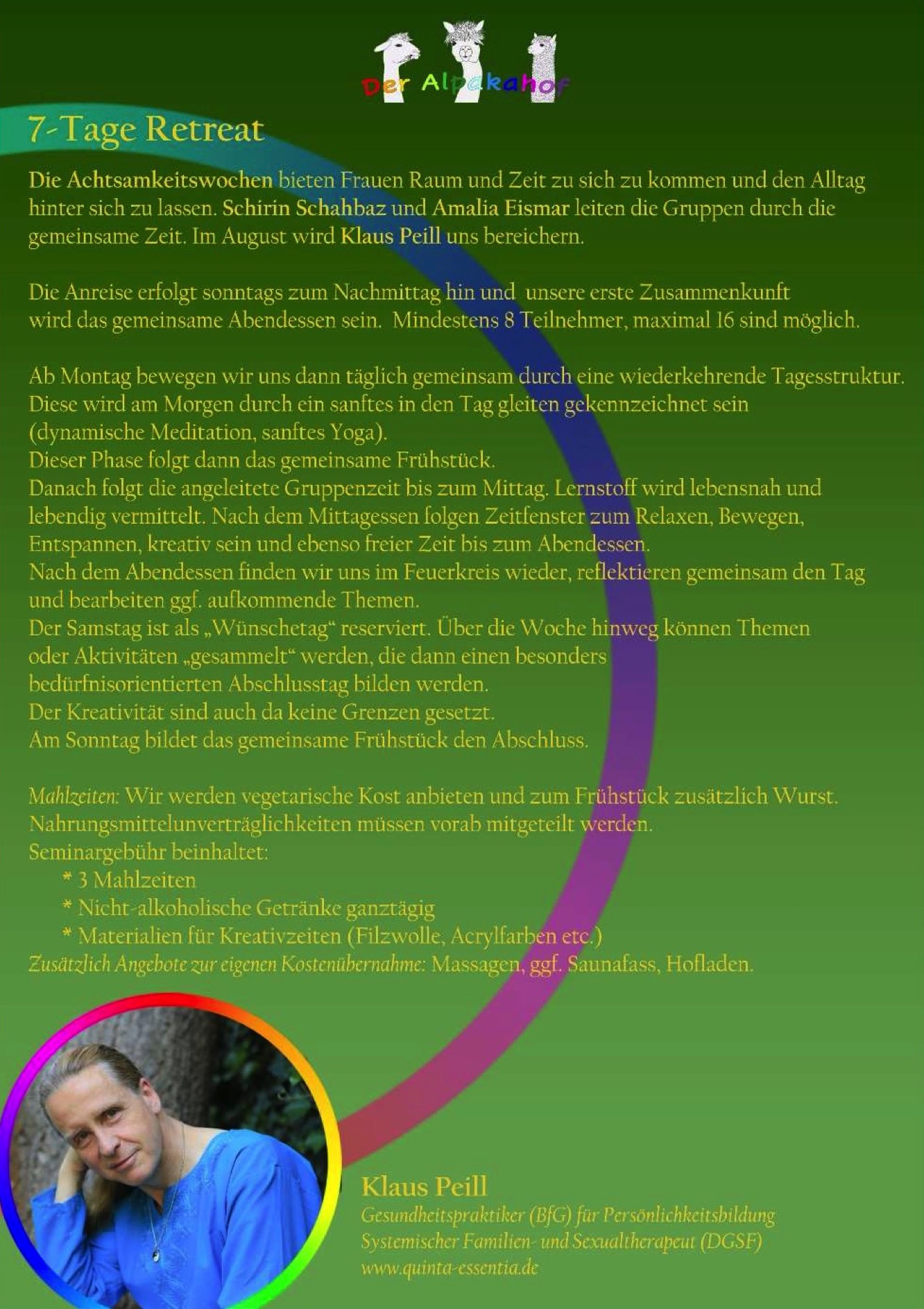 - Der Seminarpreis für 7 Tage (Inkl. 3 Mahlzeiten, alkoholfreie Getränke und Materialien) beträgt 741 €.